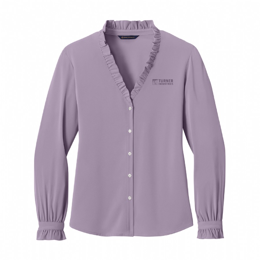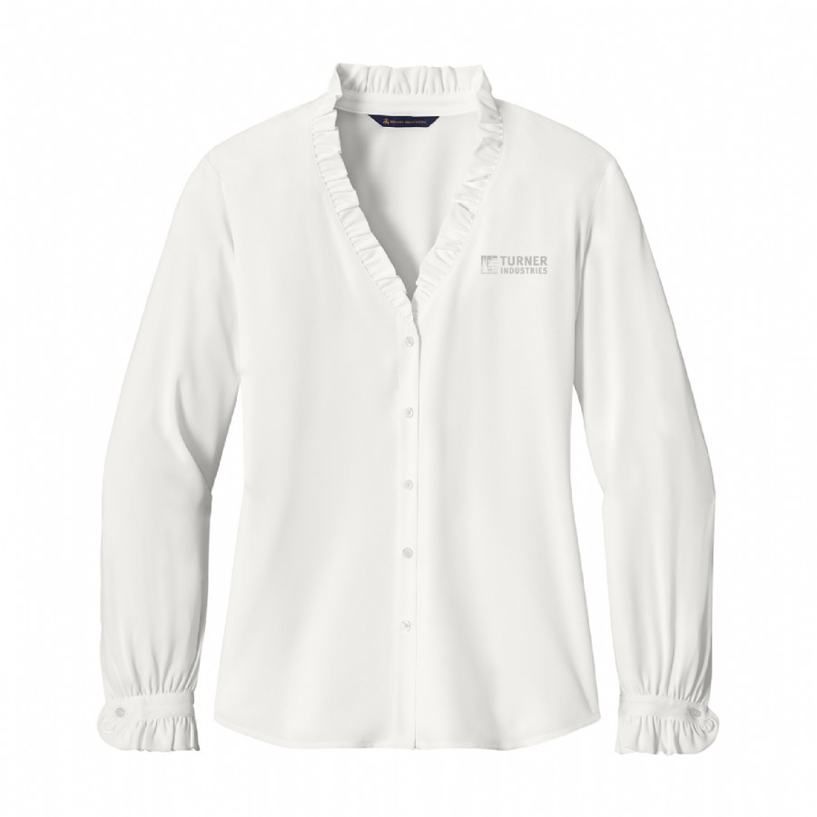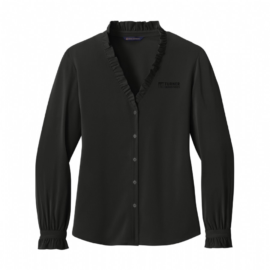 Complete with ruffle accents, this classic, feminine blouse is crafted in beautiful satin.